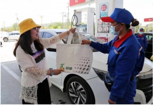 圖為中國石化青海石油分公司的加油站員工向客戶贈送環保購物袋